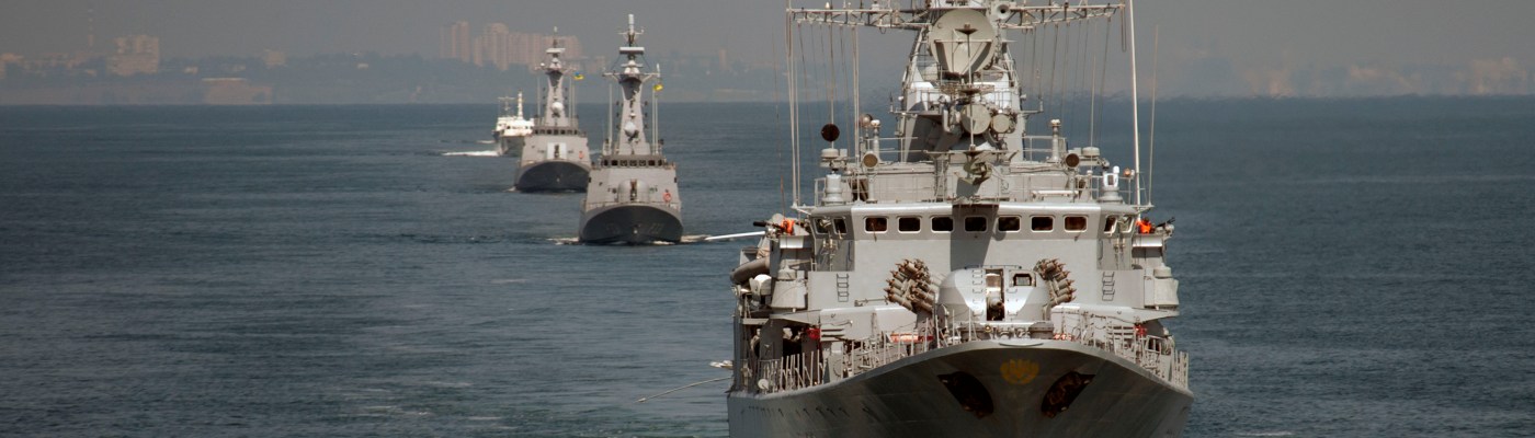 Image: Ukrainian navy frigate Hetman Sahaydachniy leading Turkish patrol boats, TCG Kalkan and TCG Tufan and the Georgian Coast guard platform Sokhumi during an exercise in the Black Sea.