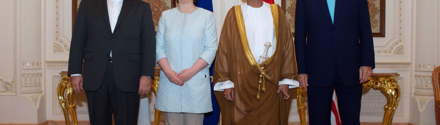 Image: U.S. Secretary of State John Kerry stands with Foreign Minister Javad Zarif of Iran, Baroness Catherine Ashton of the European Union, and Foreign Minister Yusuf bin Alawai of Oman before the U.S., Iran, and the E.U. began three-way negotiations about the future of Iran’s nuclear program in Muscat, Oman, on November 9, 2014. [State Department photo/ Public Domain]