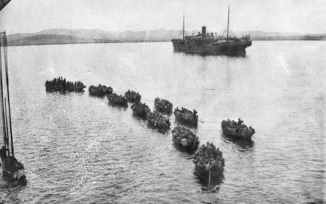 Image: Australian troops being towed ashore in lighters to land at Anzac Cove, Gallipoli. In the background is the transport ship. Photo courtesy of the Australian War Memorial.