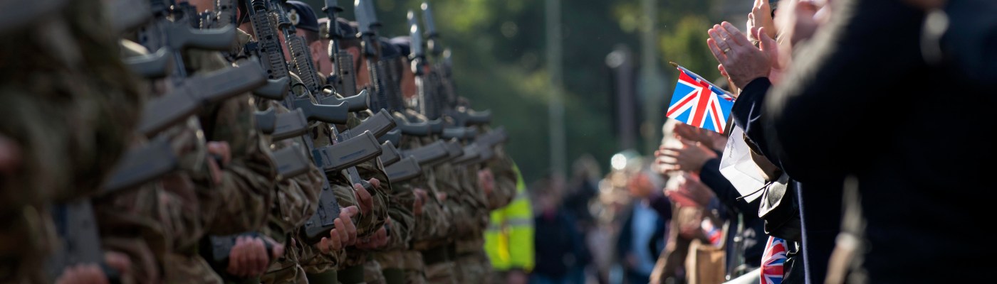 Image: Soldiers of 22 Engineer Regiment march proudly past cheering crowds during a parade through Andover, Hampshire, 12 October 2013. Photo courtesy of UK Ministry of Defence via Open Government License.