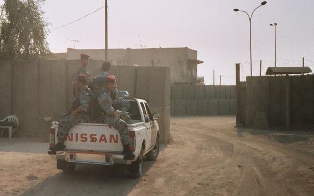 Image: A patrol from the paramilitary police Tactical Support Unit leaving a security force base in Basra, Iraq, September 2004. Property of the author, not to be reproduced without permission.