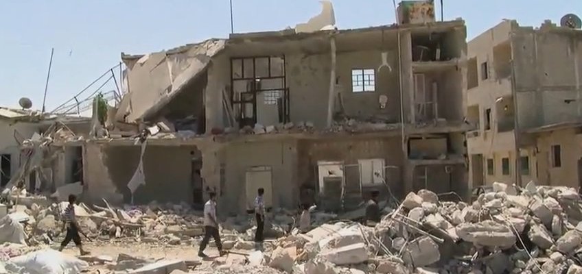 Image: Azaz residents pick up after aerial bombings. Bombed out buildings (2012). Courtesy of Wikimedia Commons.