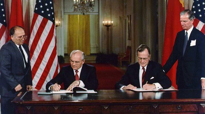 Image: President George H. W. Bush and President Mikhail Gorbachev sign United States/Soviet Union agreements to end chemical weapon production and begin destroying their respective stocks in the East Room of the White House, Washington, DC on the 1st of June 1990. Courtesy of Wikimedia Commons.