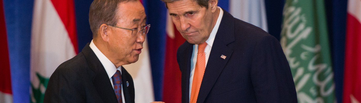 Image: Secretary Kerry Chats With UN Secretary-General Ban Before Hosting the International Syria Support Group Meeting in New York City, 18 December 2015. Courtesy of Wikimedia Commons.
