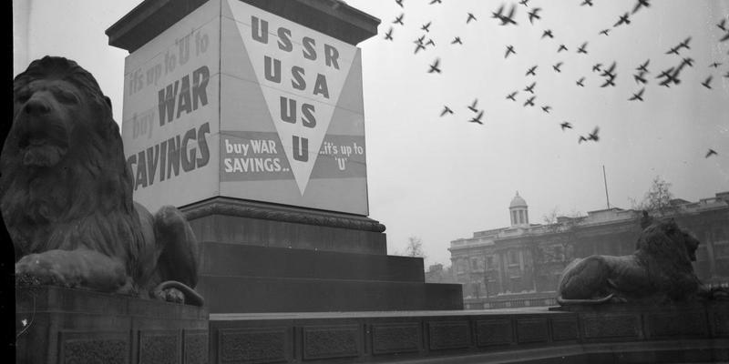 Image: A War Savings posters around the base of Nelson’s Column, Trafalgar Square. The lions at the base of the Column can also be seen, as can a flock of pigeons, flying overhead. The poster tells citizens ‘It’s up to ‘U’ to buy War Savings’, via the Imperial War Museum.