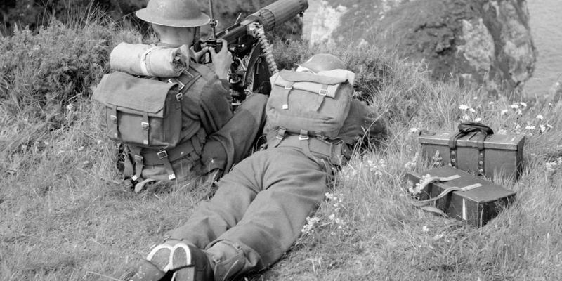 Image: Vickers machine-gun team of 2/8th Battalion, Middlesex Regiment, man their weapon on a clifftop in Northern Ireland, 15 July 1941, via the Imperial War Museum.