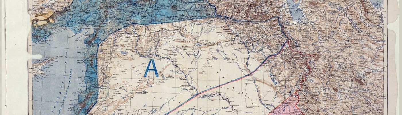Image: Map of Sykes–Picot Agreement showing Eastern Turkey in Asia, Syria and Western Persia, and areas of control and influence agreed between the British and the French. Royal Geographical Society, 1910-15. Signed by Mark Sykes and François Georges-Picot, 8 May 1916. Courtesy of Wikimedia Commons.