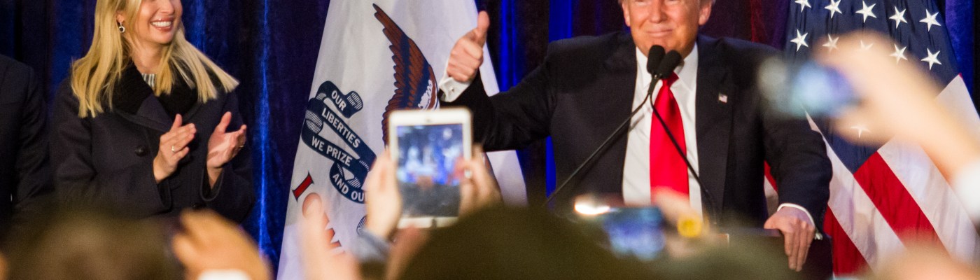 Image: Presidential candidate Donald Trump, watch party, Feb 2 in West Des Moines. Courtesy of Wikimedia Commons.