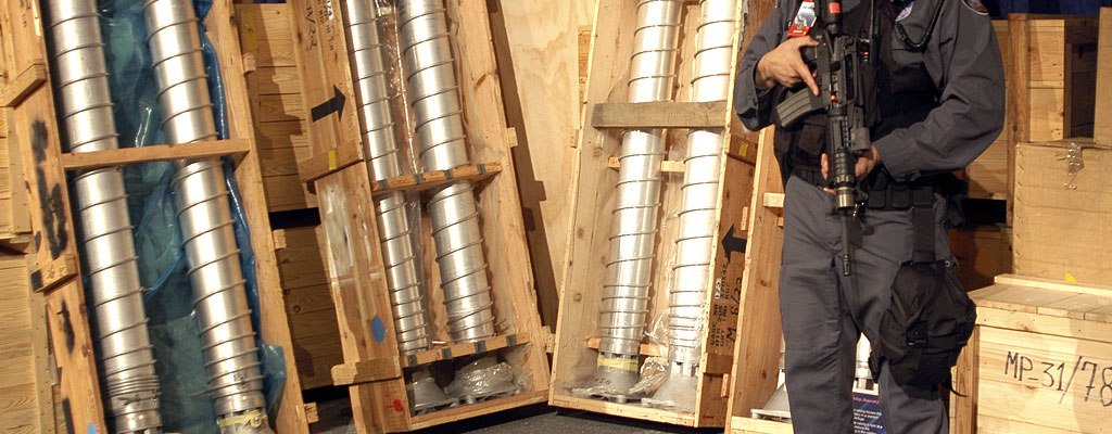 Image: Gas centrifuges for uranium enrichment recovered from the BBC China in Italy, en route to Libya, in 2003. They were later taken to the Y-12 complex in the USA where this picture was taken (with a Y-12 guard also in the picture), via wikimedia.