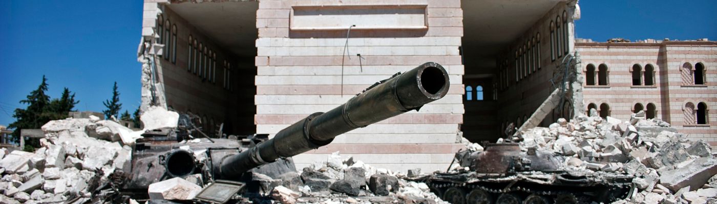 Image: Two destroyed tanks in front of a mosque in Azaz, Syria, 21 August 2012, via Wikimedia.