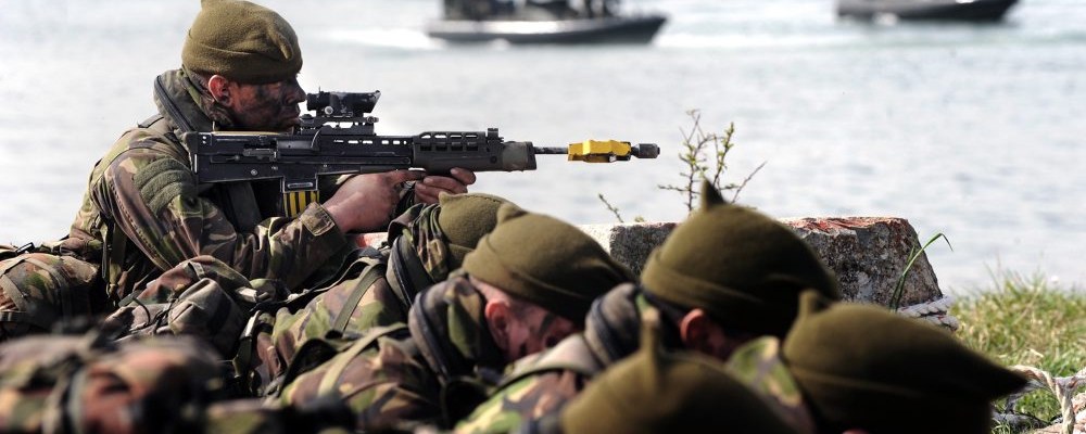 Image: Trainee Royal Marine Commandos position for an assault after a beach landing during an exercise at Bull Point in Plymouth, via flickr.