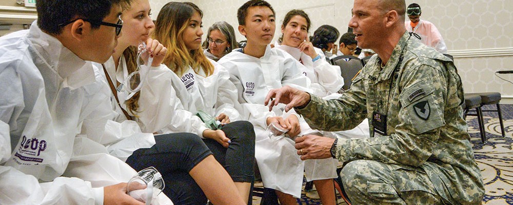 Image: SGM Kenneth Agueda, then-sergeant major of the RDECOM G-3, talks with students June 17 during the five-day eCYBERMISSION National Judging and Educational Event at Hunt Valley, MD, via the US Army.