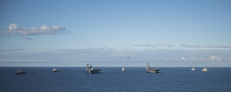 Image: The Royal Navy frigates HMS Iron Duke (F234), left, and HMS Westminster (F237), the Royal Norwegian Navy frigate KNM Helge Ingstad (F313), the Royal Navy aircraft carrier HMS Queen Elizabeth (R08), the U.S. Navy guided-missile destroyer USS Donald Cook (DDG-75), the aircraft carrier USS George H.W. Bush (CVN-77), and the guided-missile cruiser USS Philippine Sea (CG-58) underway in formation during exercise “Saxon Warrior 2017”, 8 August 2017, via wikimedia commons.