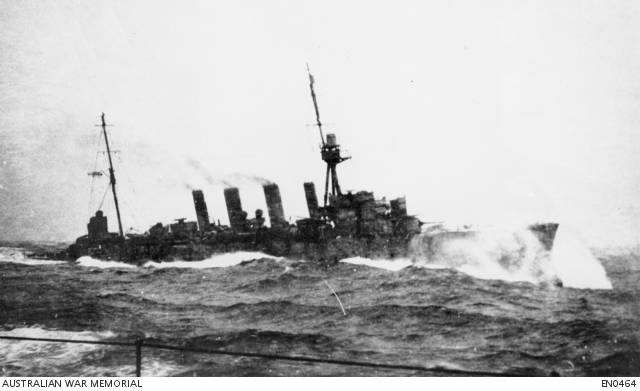 Image: The light cruiser HMAS Sydney steaming through the North Sea as seen from her fellow cruiser HMS Birmingham, via the Australian War Memorial.