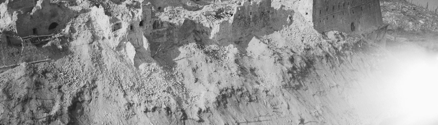 Image: Third Phase of the Battle of Cassino, 11 – 18 May 1944: A low aerial view of the Monastery showing its complete destruction, via wikimedia commons.