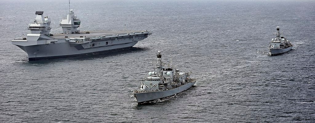 Featured Image – The Queen Elizabeth at sea in 2017, accompanied by the HMS Sutherland and HMS Iron Duke.