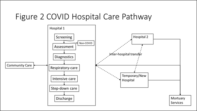 Hospitals are complex systems of systems. The same ‘care pathway’ approach is used to illustrate the potential roles of military medical services to augment the civilian hospital system and shown at Figure 2. Some nations have allowed civilians to access military hospitals, deployed military field hospitals, or converted existing buildings to augment local hospital networks. Staying at this level, military medical services have also provided ambulances, aeromedical aircraft and patient escort teams on trains and ships to assist in the movement of COVID patients between hospitals. At a tactical level, military medical personnel and teams have reinforced many components of a hospital’s clinical and support services to provide additional capacity and resilience within existing civilian hospitals. The mechanism for this reinforcement by military medical personnel has varied from provision of individuals to augment civilian teams (every case study), through to formed military teams taking over shifts or departments, to military personnel taking over the leadership of civilian hospitals.