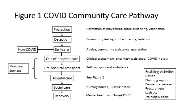 The typology described below covers the last of these groups, from three perspectives – community care, enabling activities and hospital care. It does not cover civil-military co-operation on international security missions. Our conceptual model is based on the military medical approach to summarising the evacuation of casualties, the Operational Patient Care pathway. This considers the whole system as a seamless, integrated and incremental pathway of care from point of injury through to return to duty. This model provides a structured approach to describing each step of clinical care of a COVID patient and listing examples of military contributions to this pathway.